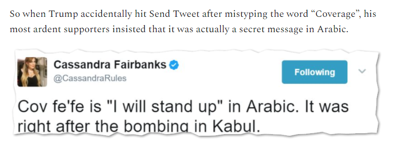 Remember covfefe, a not-at-all mysterious typo that hardcore Trumpers said was a secret Arabic message or some other code?