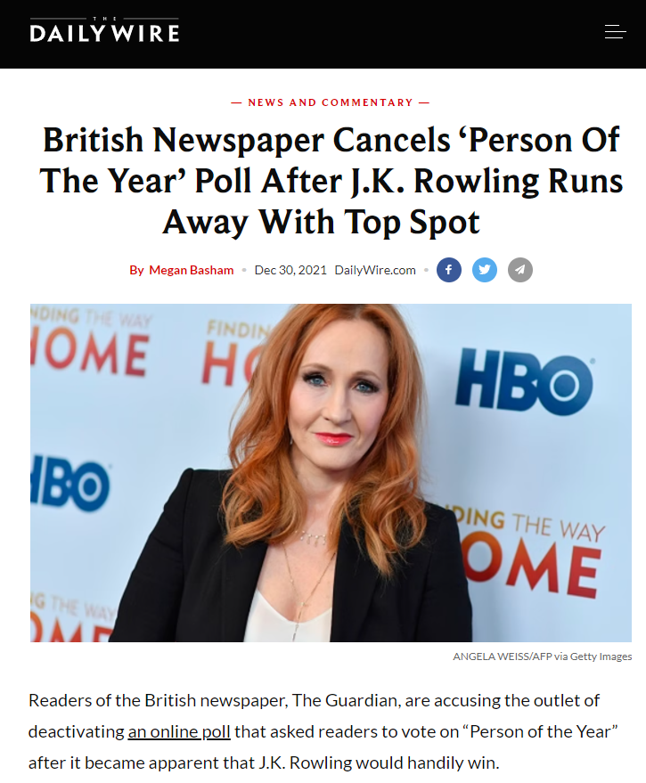 3. Twitter decides that this was a *competition* with a winner based on user votes, despite it never saying this. They further decided that JK Rowling must have been winning the competition and that the Guardian therefore scrapped it.