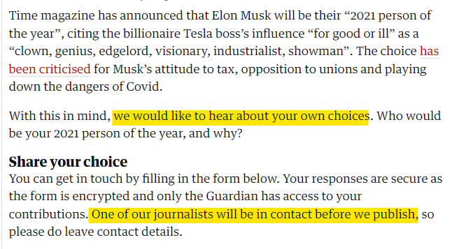 1. The Guardian decides to do a 'Who's YOUR person of the year" thingy where they'll print some reader submissions, eg "My person of the year is Britney cos she's free now" or whatever.