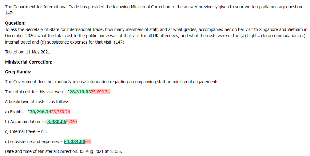 Back in December 2020, Truss and 3 staff went on a four-night trip to Singapore and Vietnam to sign the cut-and-paste rollover agreements to maintain free trade post-Brexit. After details of the visit were published on 7th May 2021, I asked how much it had all cost. (2/6)