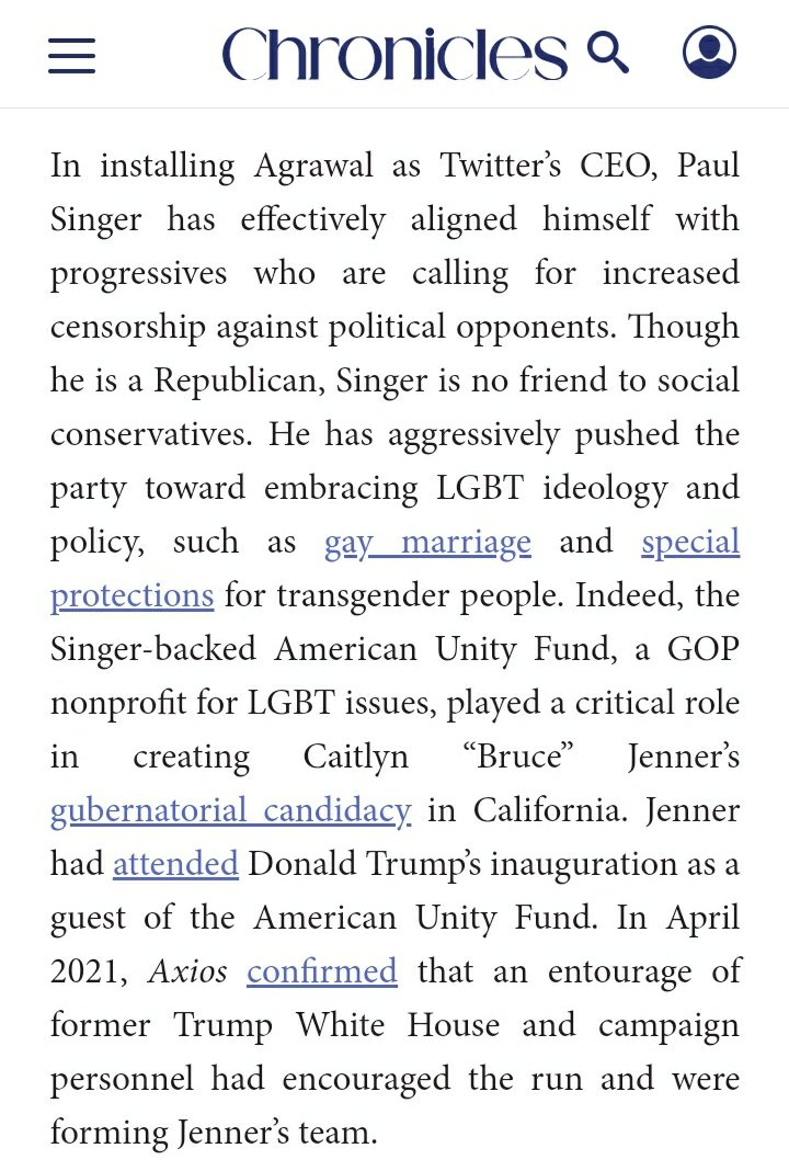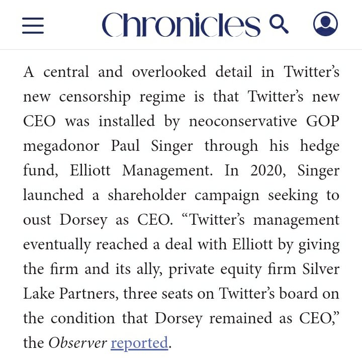 But the main story here is that the new Twitter CEO and, by extension, the new censorship regime, can be credited to Republican donor Paul Singer, who ousted Jack Dorsey and installed Agrawal
