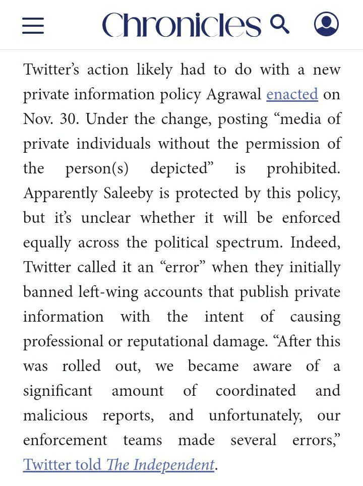 Before MTG's ban, a new private information policy Agrawal enacted on Nov. 30 also resulted in a Project Veritas affiliated Twitter account being banned for exposing a CNN producer who talked about sex acts with his underage step daughter and solicited pictures of another minor