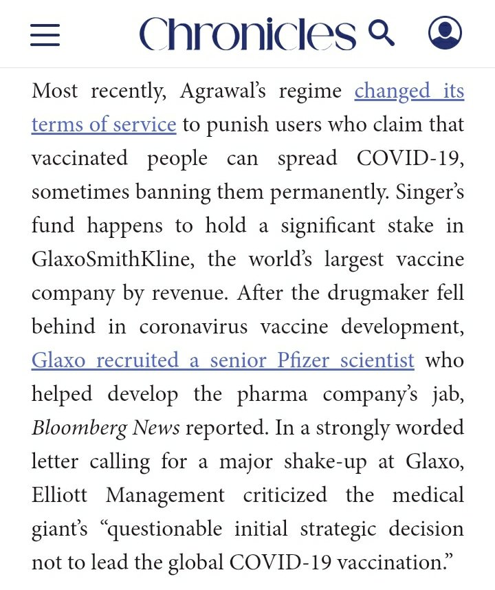 Singer also has a vested interest in Twitter cracking down on people who are critical of big pharma: criticism of vaccines hurts his bottom line