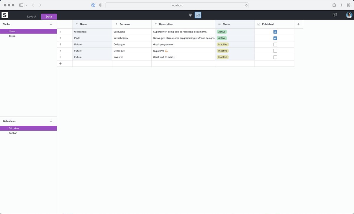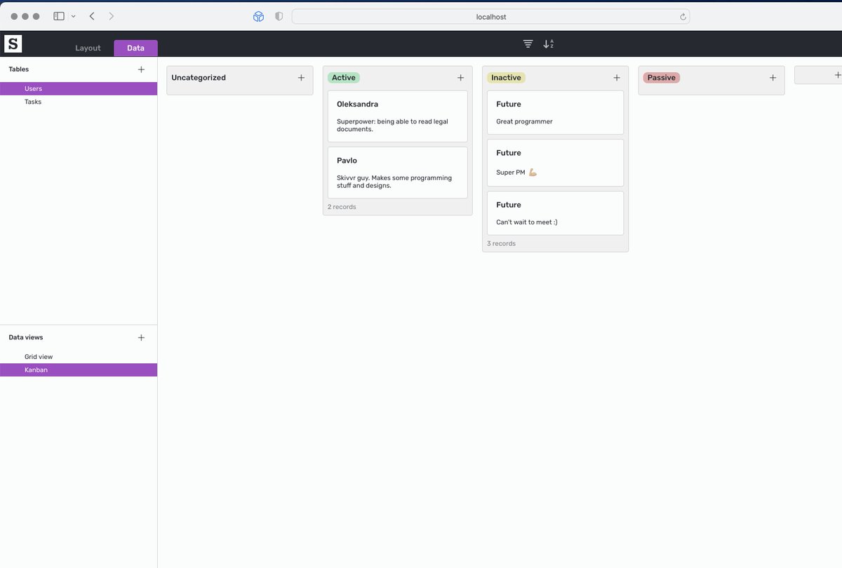 After releasing Beta, we will polish it and continue working on a data management part. We have an Airtable-like interface, with tight integration with our designer. It will be possible to use tables like a CMS or create specific data views like Kanban, Knowledgebase, or Cards.