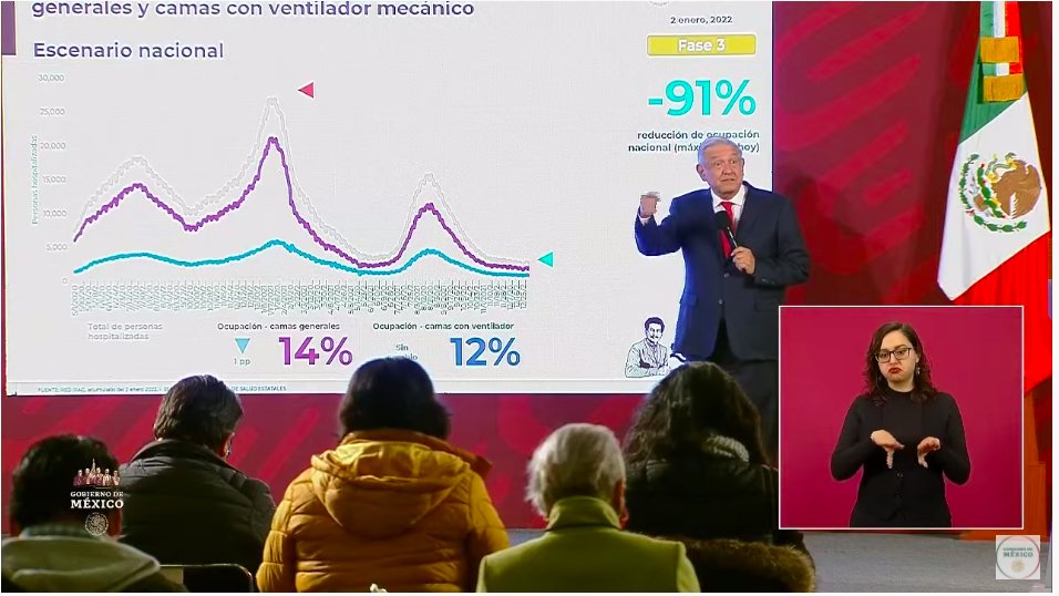 "Sí hay más contagios, pero no hay hospitalización", reitera el presidente López Obrador al mostrar gráficos sobre la disponibilidad de camas en hospitales.