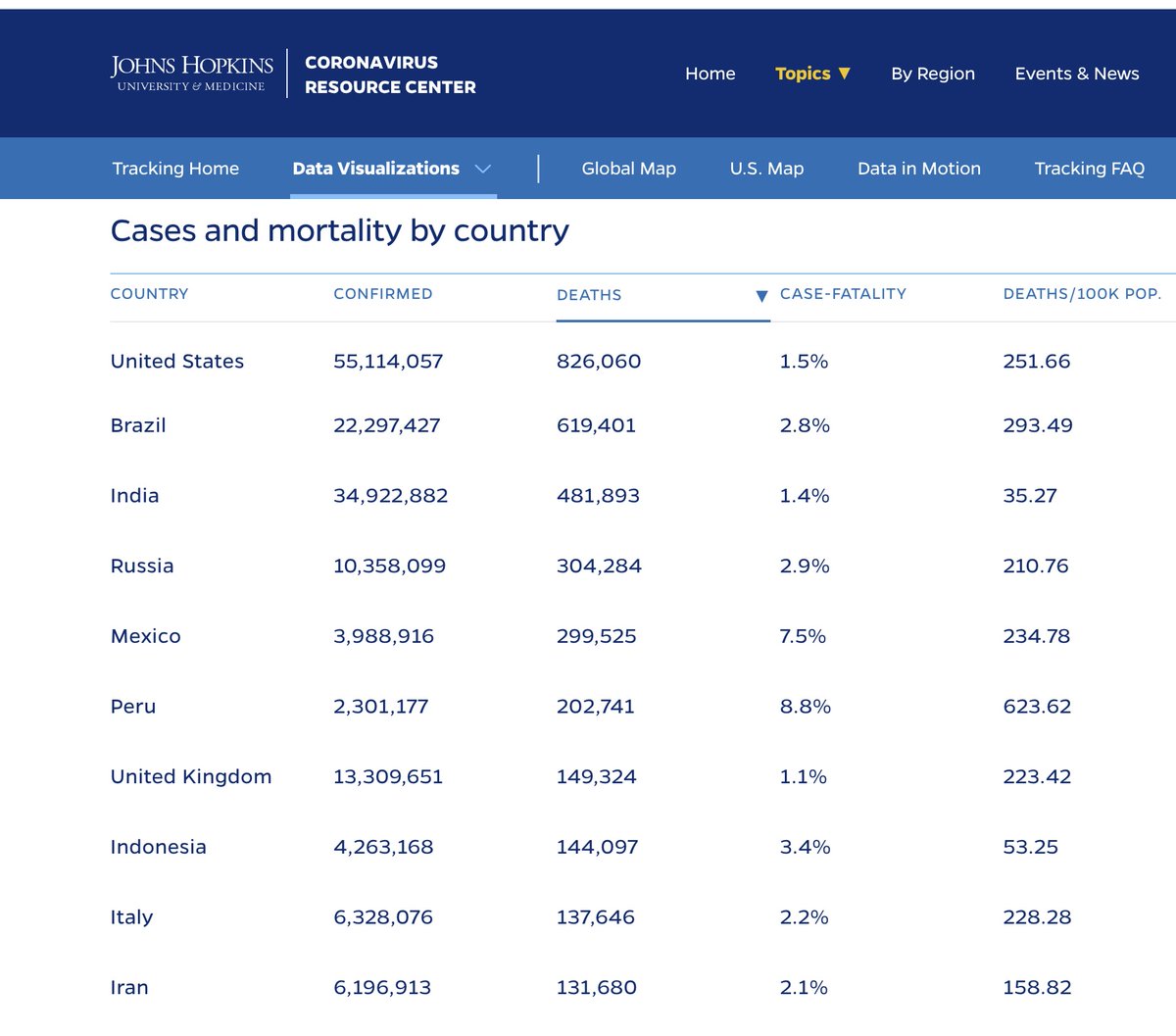 Y aquí la jerarquización de países del mundo, en términos de total de muertes por #covid, sin distinción de su grado de afectación. México ocupa el 5to lugar y EUA el 1ero.