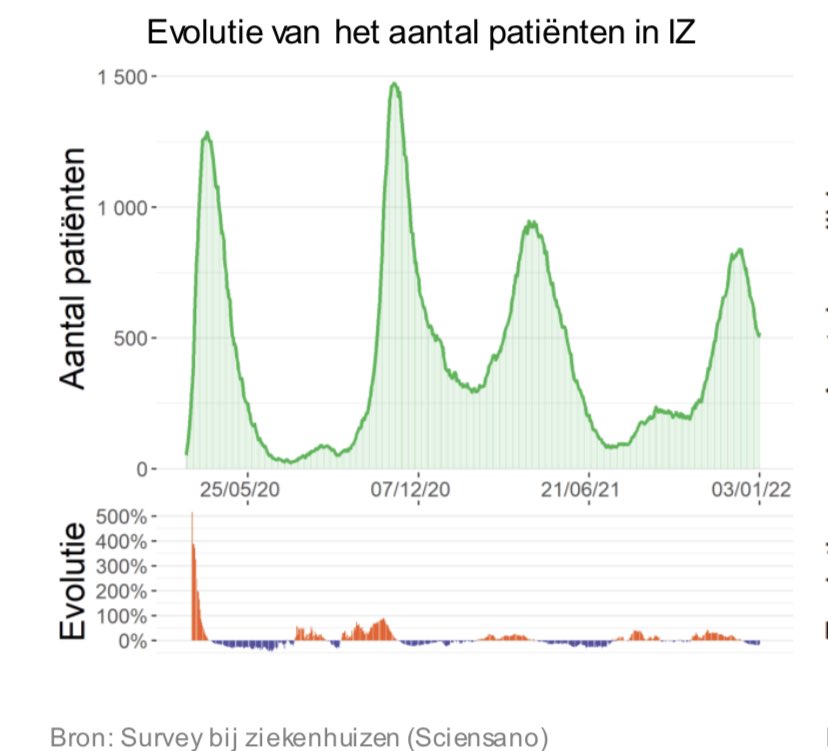 Door het grote aantal zieken, zullen (ook al is omikron minder ziektemakend) toch meer zieken dienen opgenomen worden in het het ziekenhuis, en sommigen ook op IZ. En IZ ligt momenteel nog redelijk vol met delta-patiënten. We zijn nog nooit een golf zo hoog gestart op IZ.