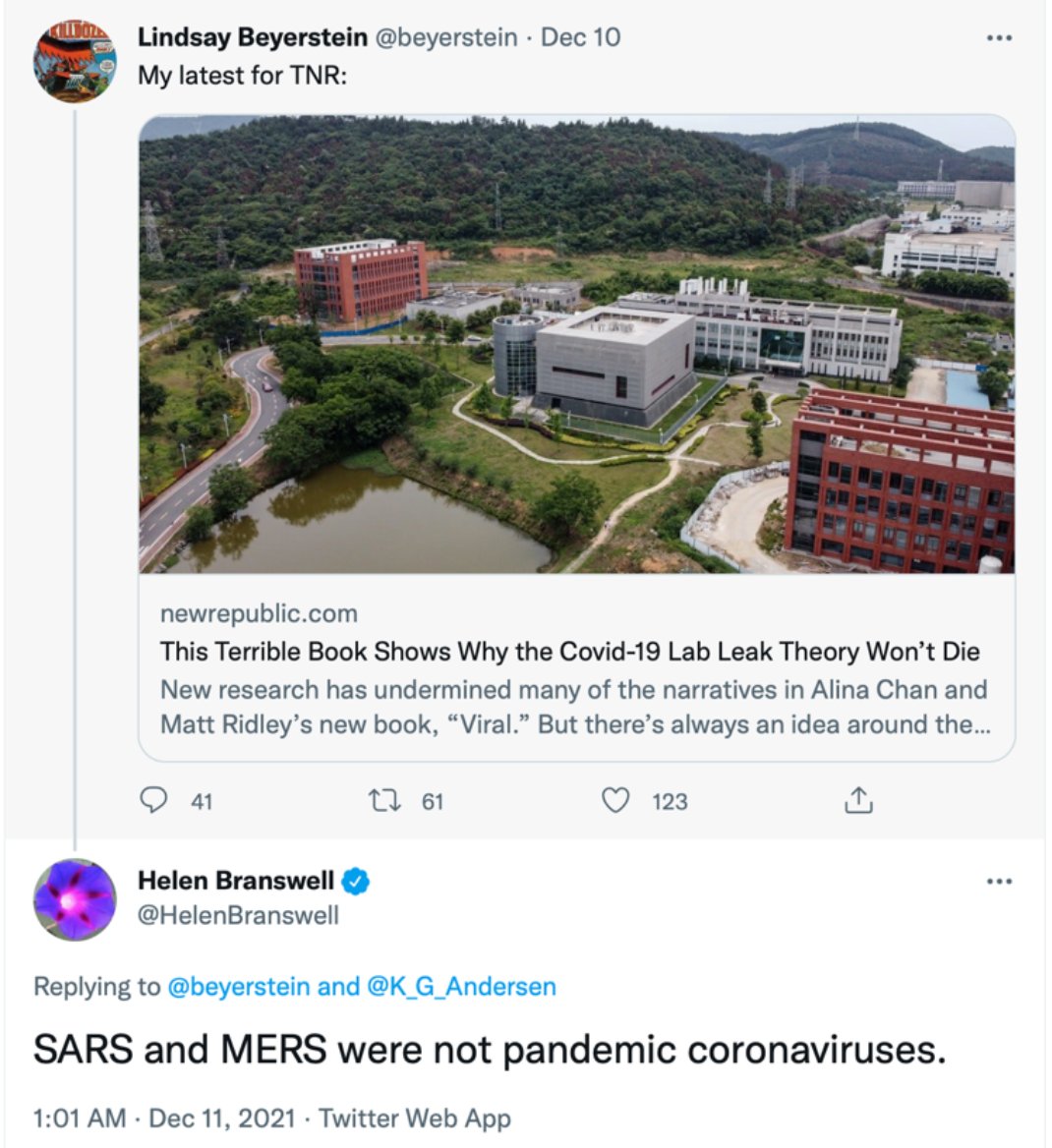 In her book, Dewar notes: in January 2020, Shi Zhengli of the Wuhan Institute of Virology submitted a study to @Nature and another study to a different journal that contradicted the Nature paper. Neither have been corrected. (Who peer reviews Nature studies?) #originsofcovid /3