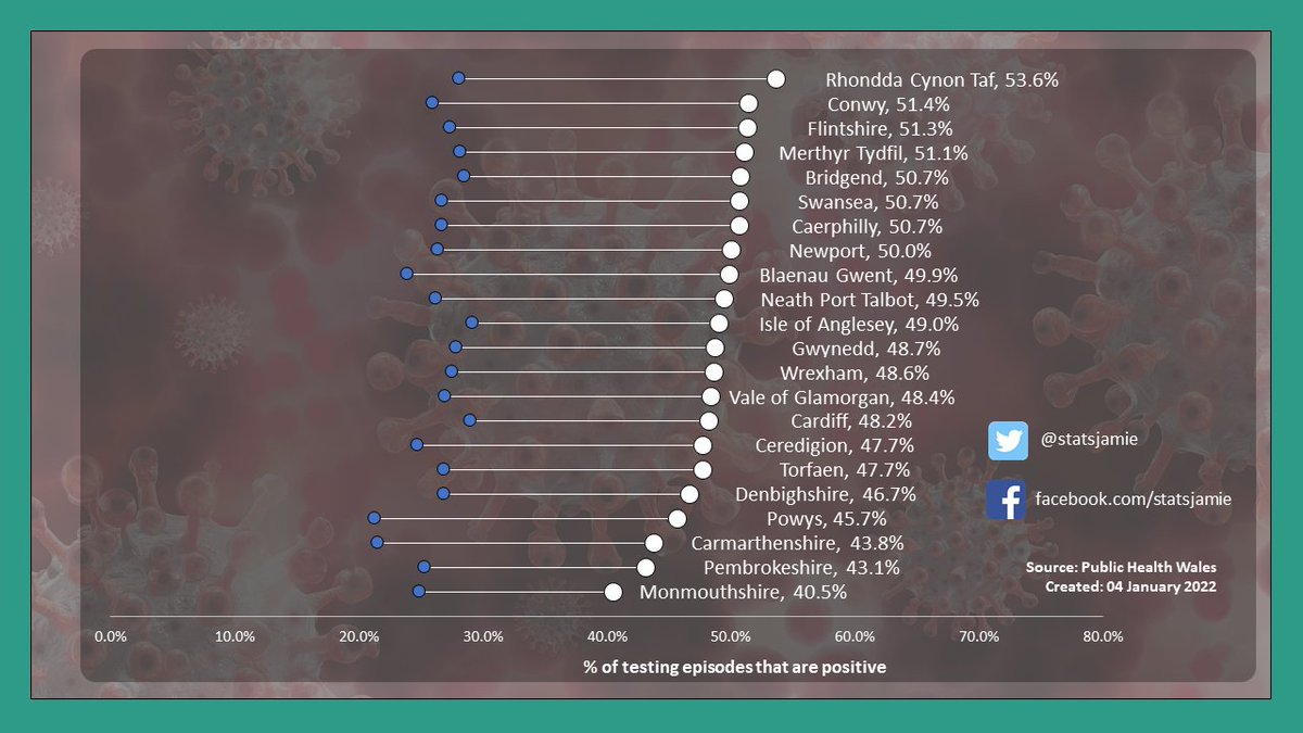 The positivity rate in Wales is highest in Rhondda Cynon Taf where 53.6% of tests carried out in the 7 days to 29 Dec coming back positive.