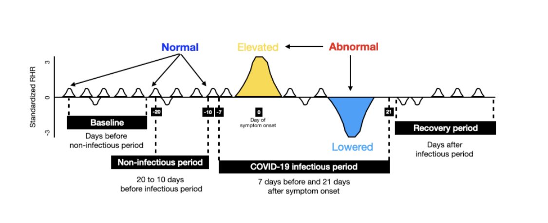 🤨 Bogu et al. 2021 en un preprint observan que la frecuencia cardíaca en reposo aumentaría 7 días antes del inicio de los síntomas en el 92 % de pacientes.