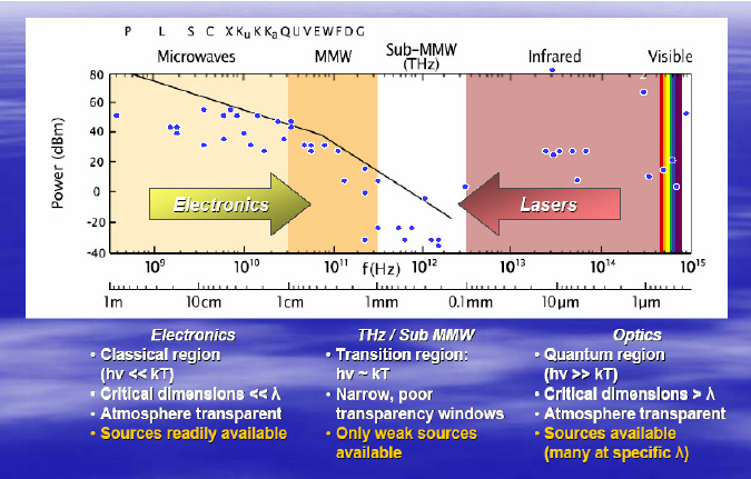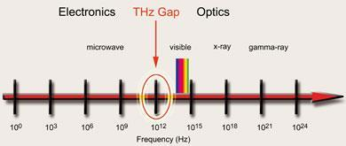 Teknologi di spectrum Tetrahertz minim. Gelombang yg lebih panjang (frekuensi lebih rendah) itu wilayah elektronik, spt gelombang radio, microwave. Gelombang yg lebih pendek (frekuensi tinggi) penuh dgn teknologi laser.