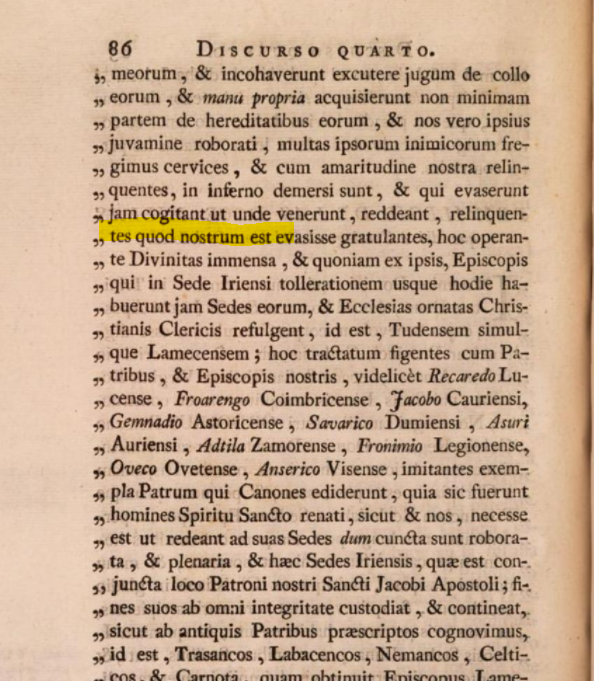 cuya ciudad por oculto juicio de Dios fué poseida por los moros, que en comun blasfeman del nombre de Cristo, por espacio de 376 años (...) Yo Alfonso, Emperador, con el auxilio de cristo pudiera volver á los fieles cristianos lo que la pérfida gente les habia quitado.