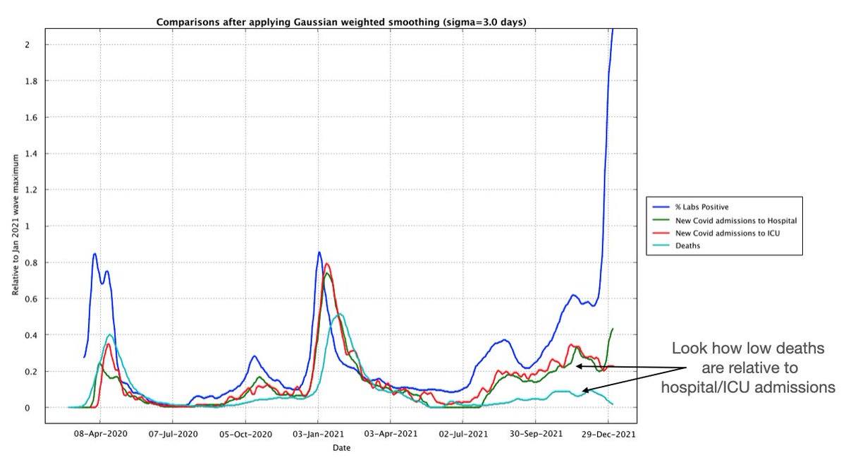 * Deaths for the first wave were at a similar level to hospital/ICU admissions. For the Jan 21 wave they were half. Now they seem to be even lower again.