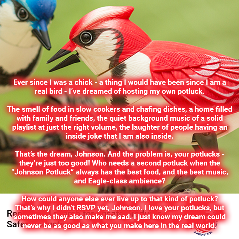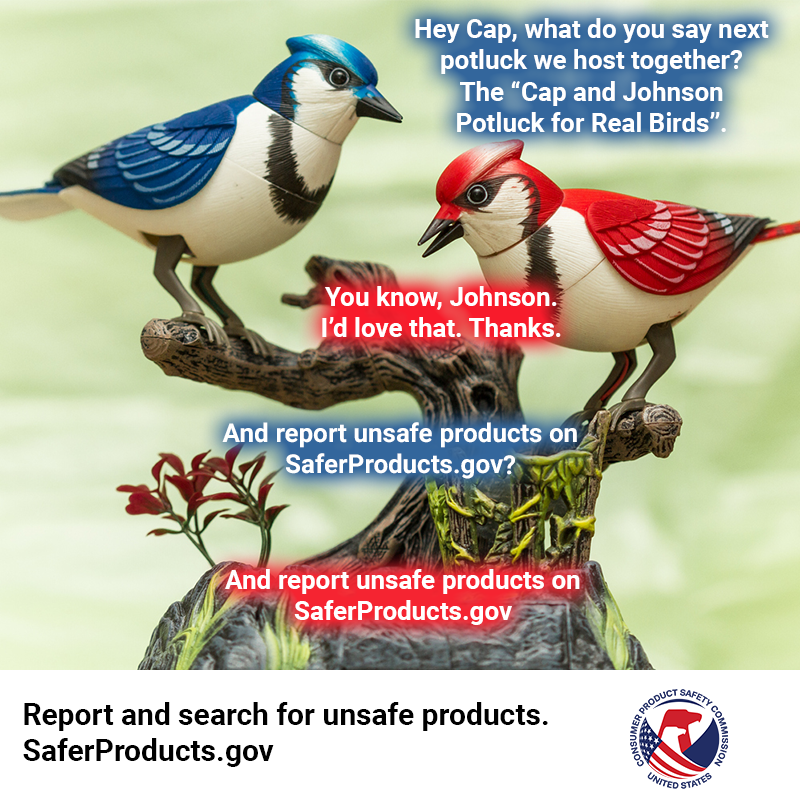 Have to mute this soon, but thank you everyone for helping spread the word about SaferProducts.gov. You're all great. Even the people who are just like, "Interesting." That's succinct, Johnson. We'll take it, friend. See you at the potluck for real birds.