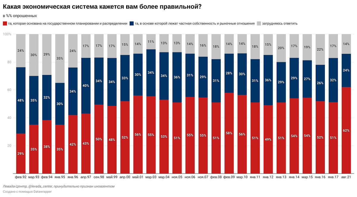 In August, 49% supported "the Soviet system as it was before the 90s", 18% - "the current system", 19% - "Western-style democracy".