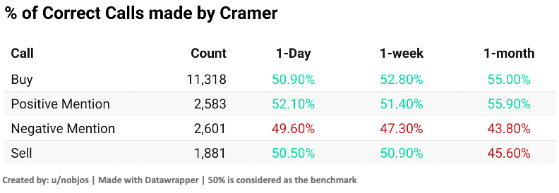 In his Buy and Positive recommendations, Cramer did only slightly better than a coin toss with his predictive powers becoming worse in Sell recommendations.