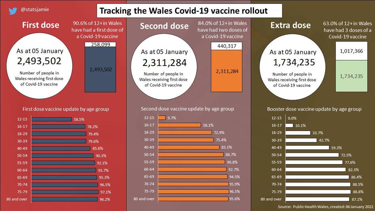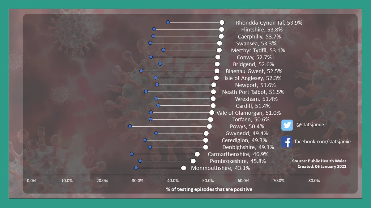 The positivity rate in Wales is highest in Rhondda Cynon Taf where 53.9% of tests carried out in the 7 days to 01 Jan coming back positive.