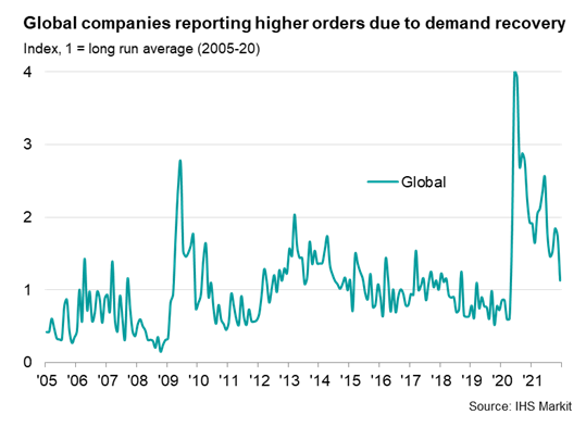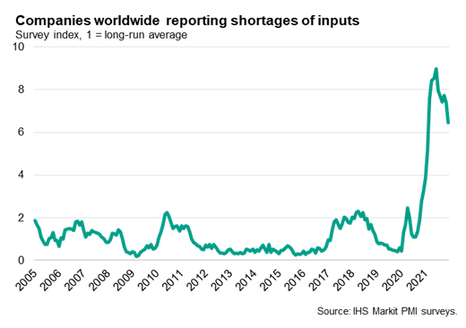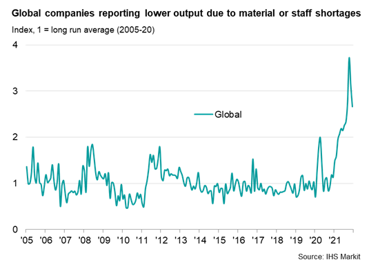 Measured globally, the number of companies reporting that output was constrained by raw material or staff shortages fell for a second month in December, down from an unprecedented peak in October, albeit still running almost three times higher than the long-run average.