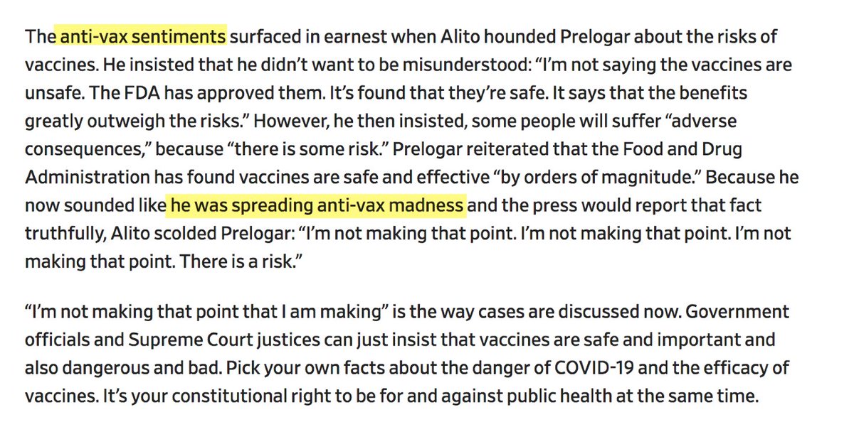 Alito couldn't have been more clear: he wasn't making any kind of "anti-vax" point, he was establishing that OSHA has never before imposed a regulation on workers that inflicts some risk of adverse health effects, however remote. But of course gets smeared as "anti-vax" anyway