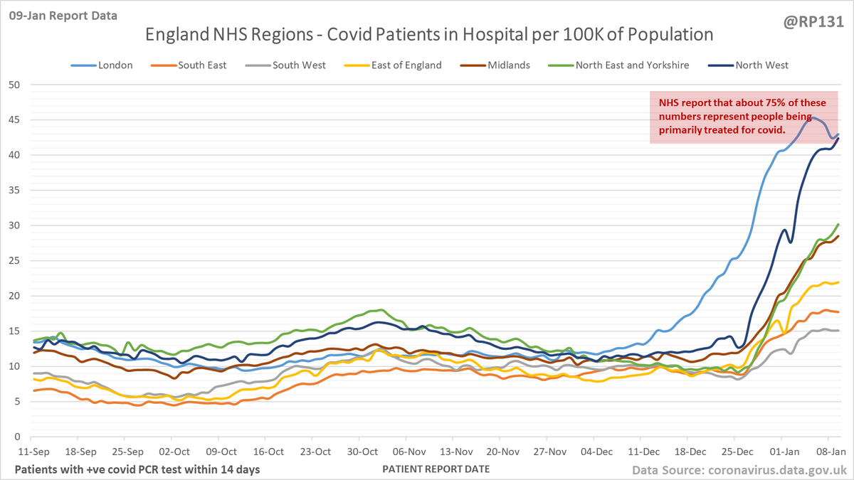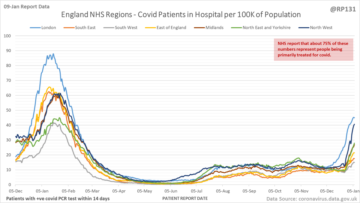 #covid19uk - Detailed positive tests thread. The majority of this thread is a set of views of rolling 7 day average positives per 100K by specimen date. Starting with England regions: