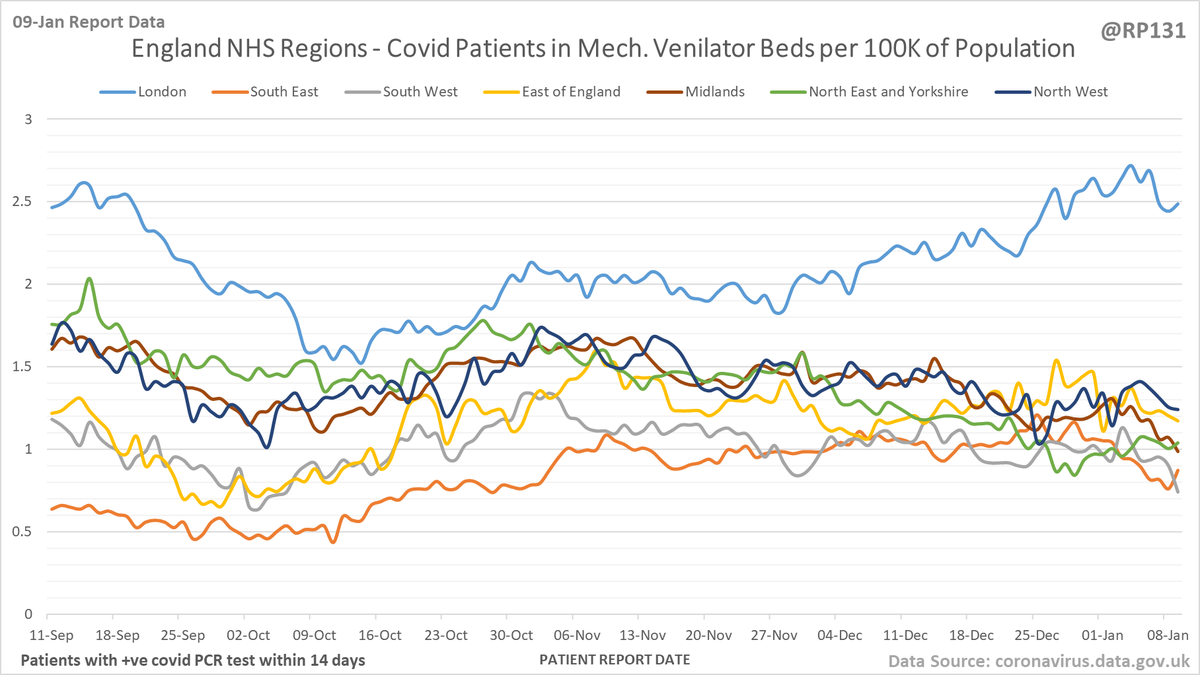 Latest view on England mechanical ventilator beds (with a positive covid test), as of 8am on 10-Jan.