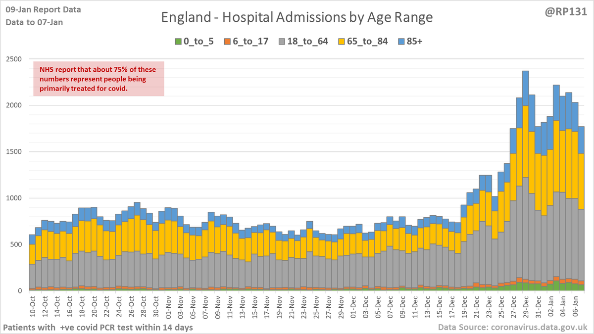 Age ranges of England hospital admissions. Note this age-range data lags a day or so behind the above totals data.