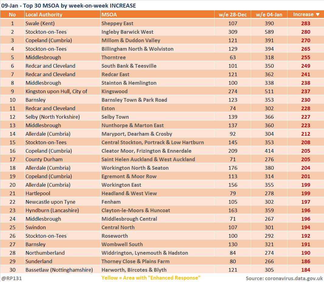 Updated (09-Jan) table of top 30 MSOAs (by rate) based on latest numbers in today's report.
