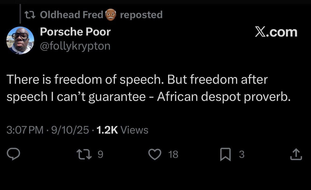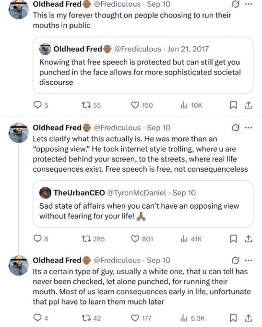 He seems to think that Charlie Kirk got what he had coming to him and that he had to learn there are consequences for what you say the hard way.