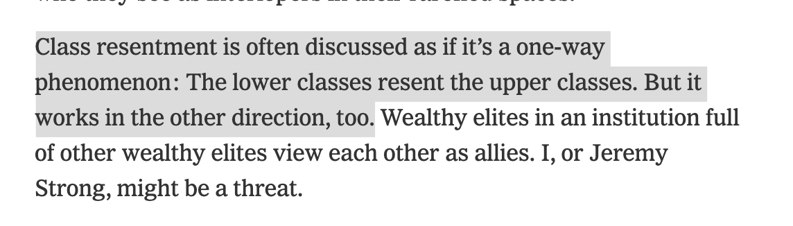 bc, as as @espiers puts it so well, "Class resentment is often discussed as if it’s a one-way phenomenon: The lower classes resent the upper classes. But it works in the other direction, too."