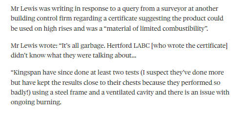 NHBC fire engineer John Lewis wrote this about Kingspan's K15 insulation in November 2014. But the firm (Britain's largest building control inspector) continued to sign off high rise projects containing the insulation