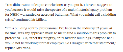 Steve Evans of the NHBC (largest building control body in the UK) was on the panel and agreed with Jenkins that an "anomaly" in official guidance this type of cladding "would meet the regulations". He told the inquiry today this was not his view and it was "badly worded"