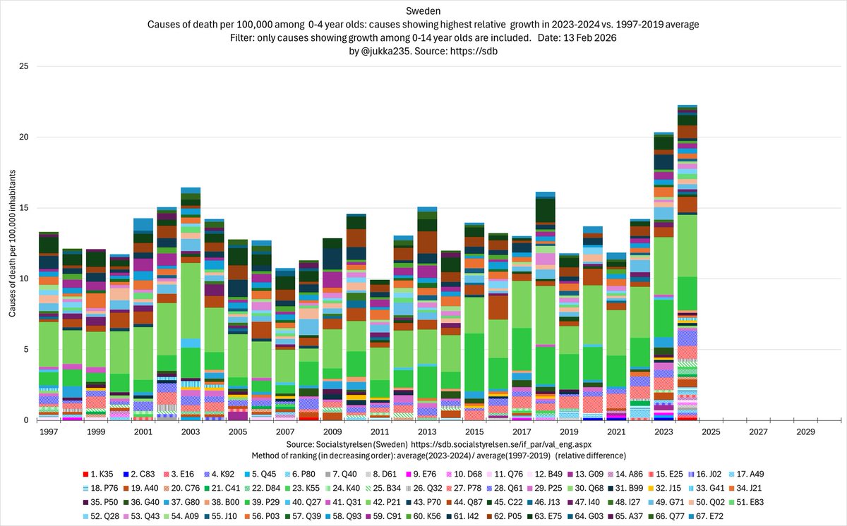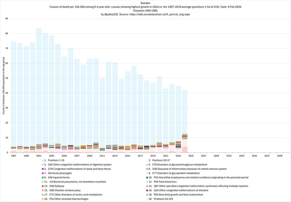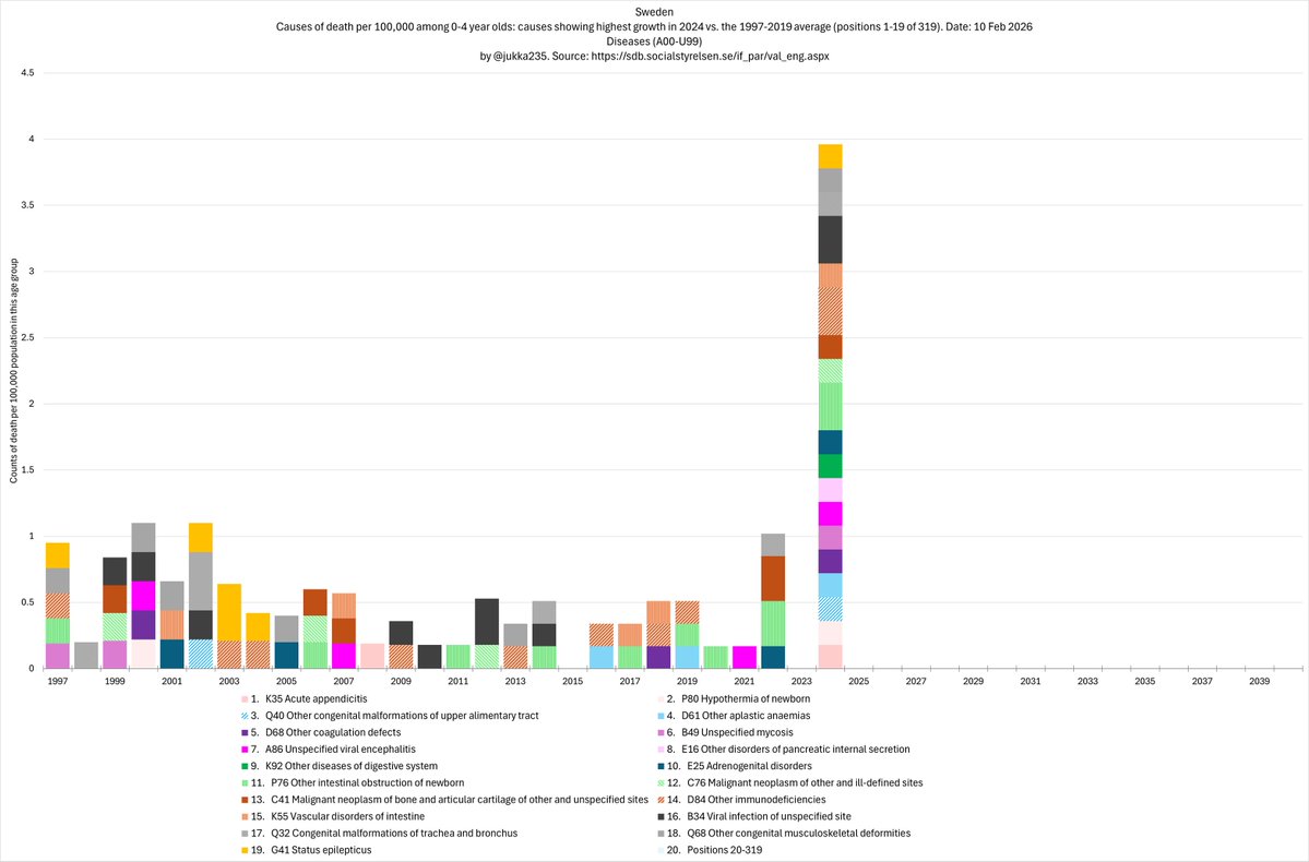 Among 0-4 year olds, the 19 causes of death with the highest growth (2004 compared with the 1997-2019 average) have increased since 2019 at an average rate of 51% per year. 2/x