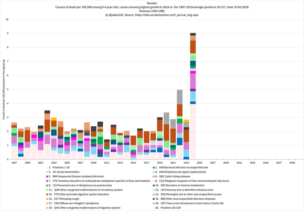Among 0-4 year olds, adding the next 18 causes brings the total to the top 37 fastest growing causes of death. Together, these have increased since 2019 at an average rate of 24.6% per year, compared with just 0.6% per year during 1997-2019. 3/x