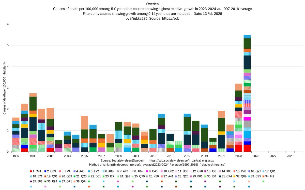 Here are the 19 leading causes of death among 10-14 year olds, ranked by their 2024 incidence compared to the 1997-2019 average. Together, they account for 35% of all deaths in 2024. 2/x