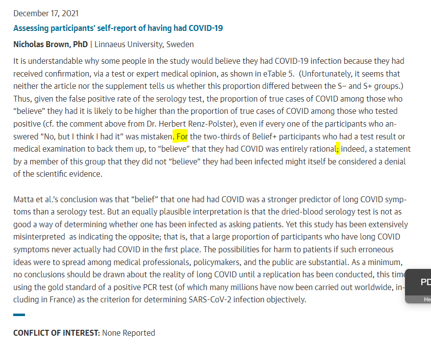 D. Strain : “It misses a very simple explanation. Whether the participants had COVID or not, there is no doubt that they were experiencing some illness that they attributed to COVID. There are multiple viral illness other than COVID that cause “long symptoms””.