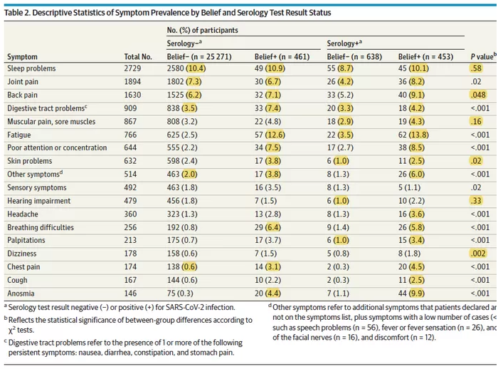 D'abord parce que le tableau 2 montre bel et bien une association entre la sérologie et une multitude de symptômes persistants.