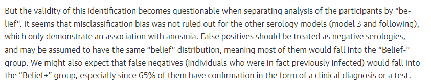 Ce qui fait 3 preuves 𝗶𝗻𝗱𝗲́𝗽𝗲𝗻𝗱𝗮𝗻𝘁𝗲𝘀 (1/ anosmie, 2/ 40%, 3/ mauvaise classification avec un taux de faux positifs et de faux négatifs très élevé dans les sous-groupes considérés) que ce que les auteurs appellent la "croyance" dans la cohorte étudiée, est