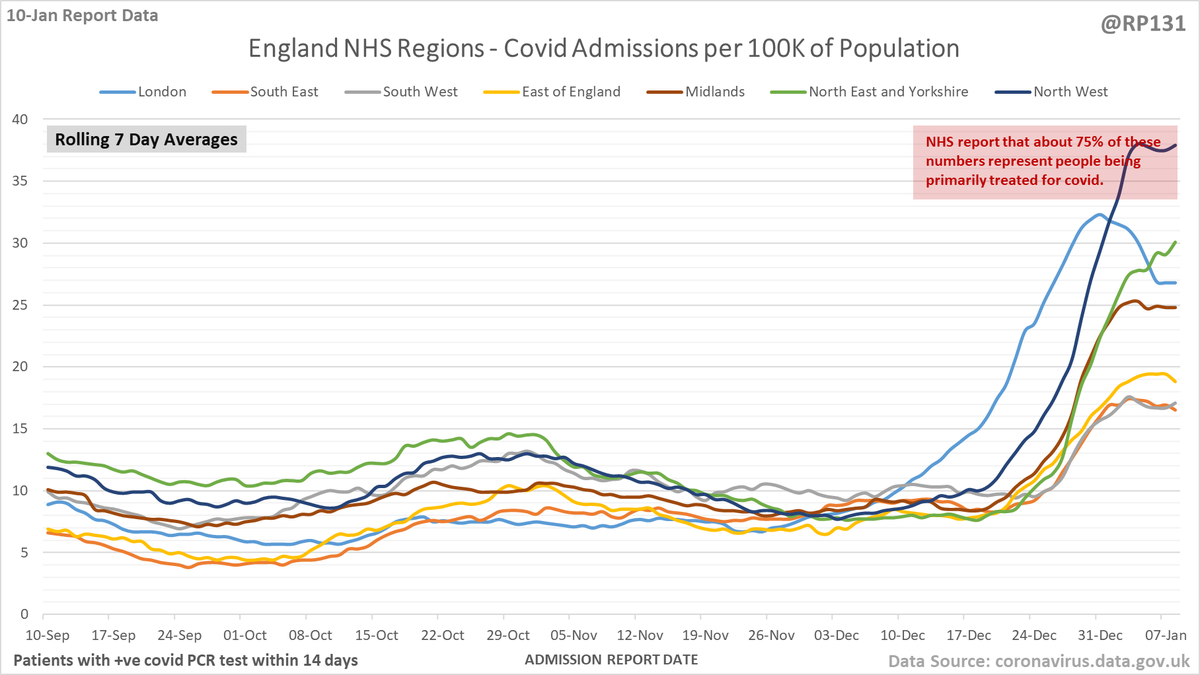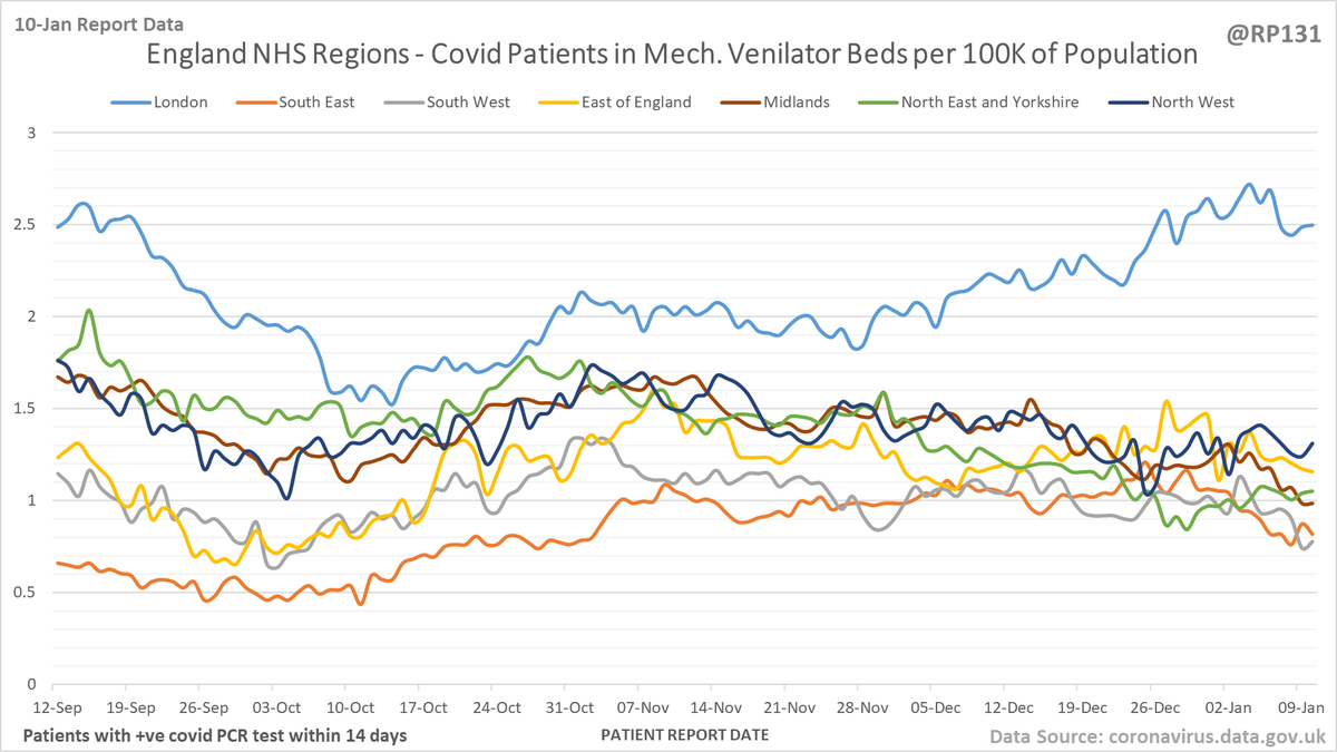 #covid19uk - Detailed positive tests thread. The majority of this thread is a set of views of rolling 7 day average positives per 100K by specimen date. Starting with England regions: