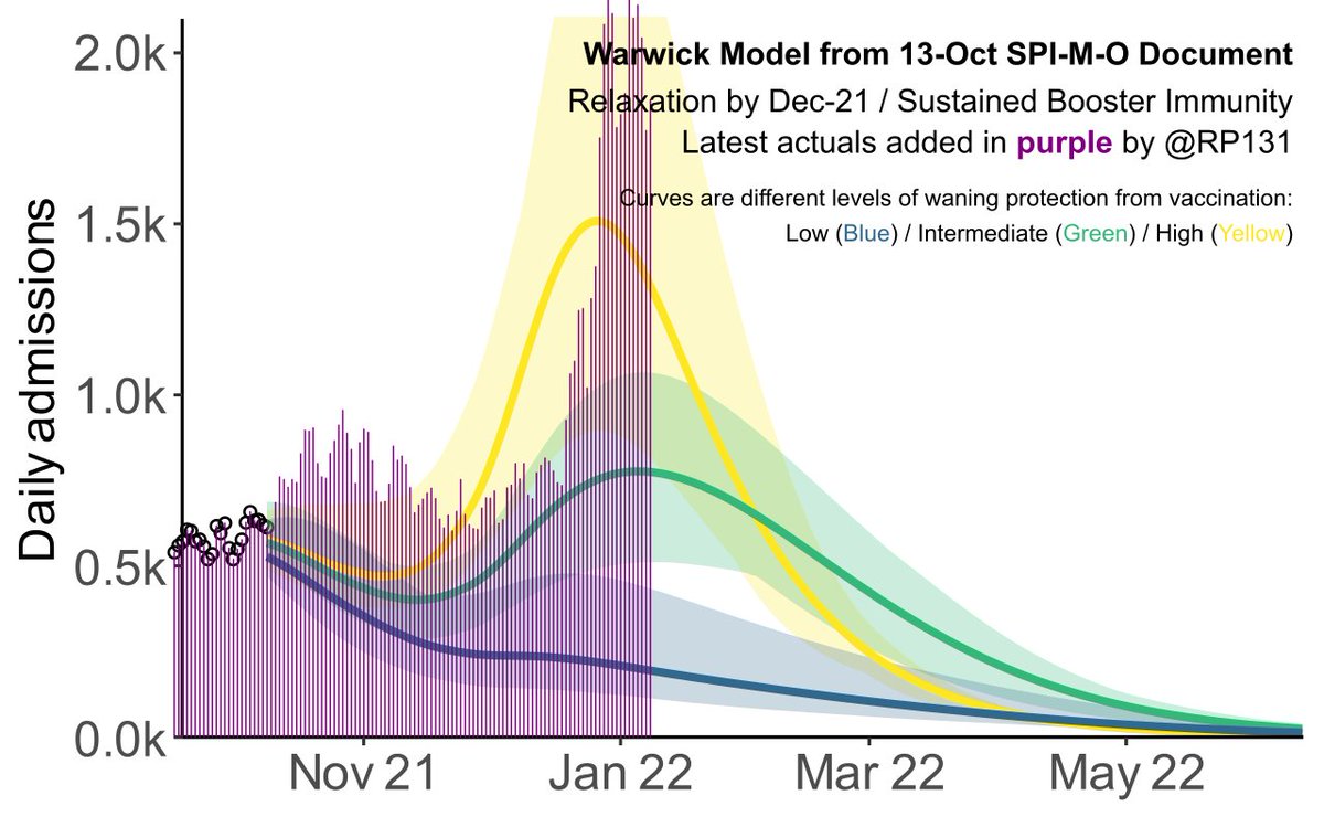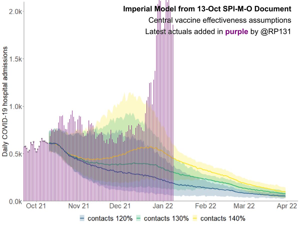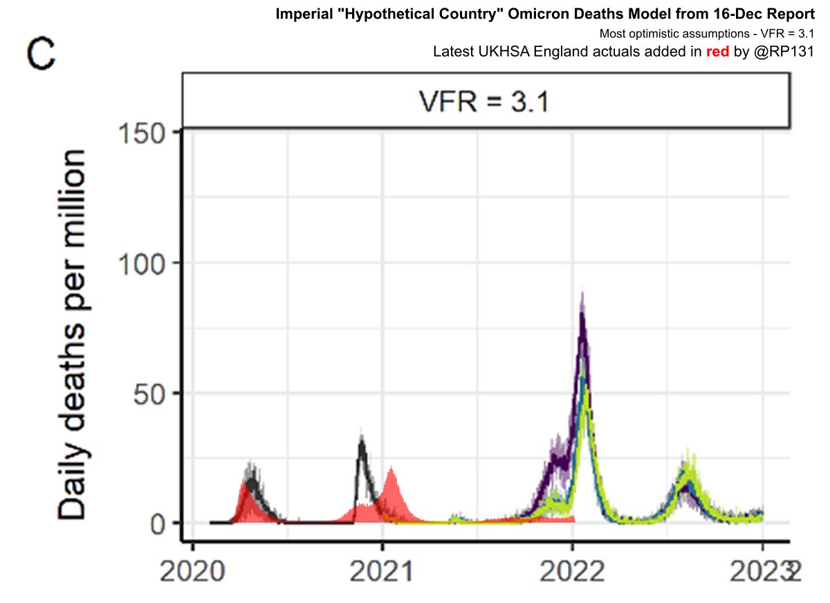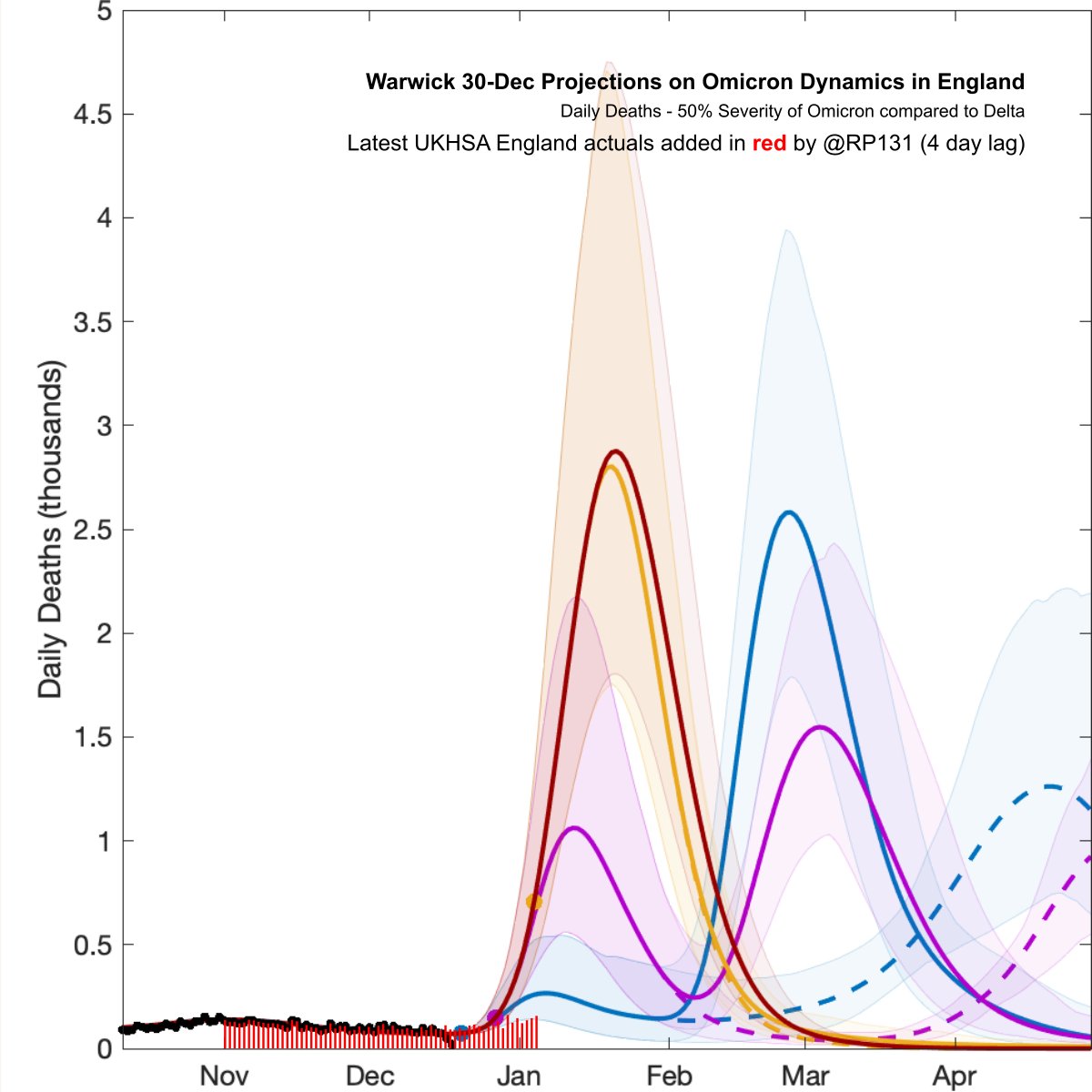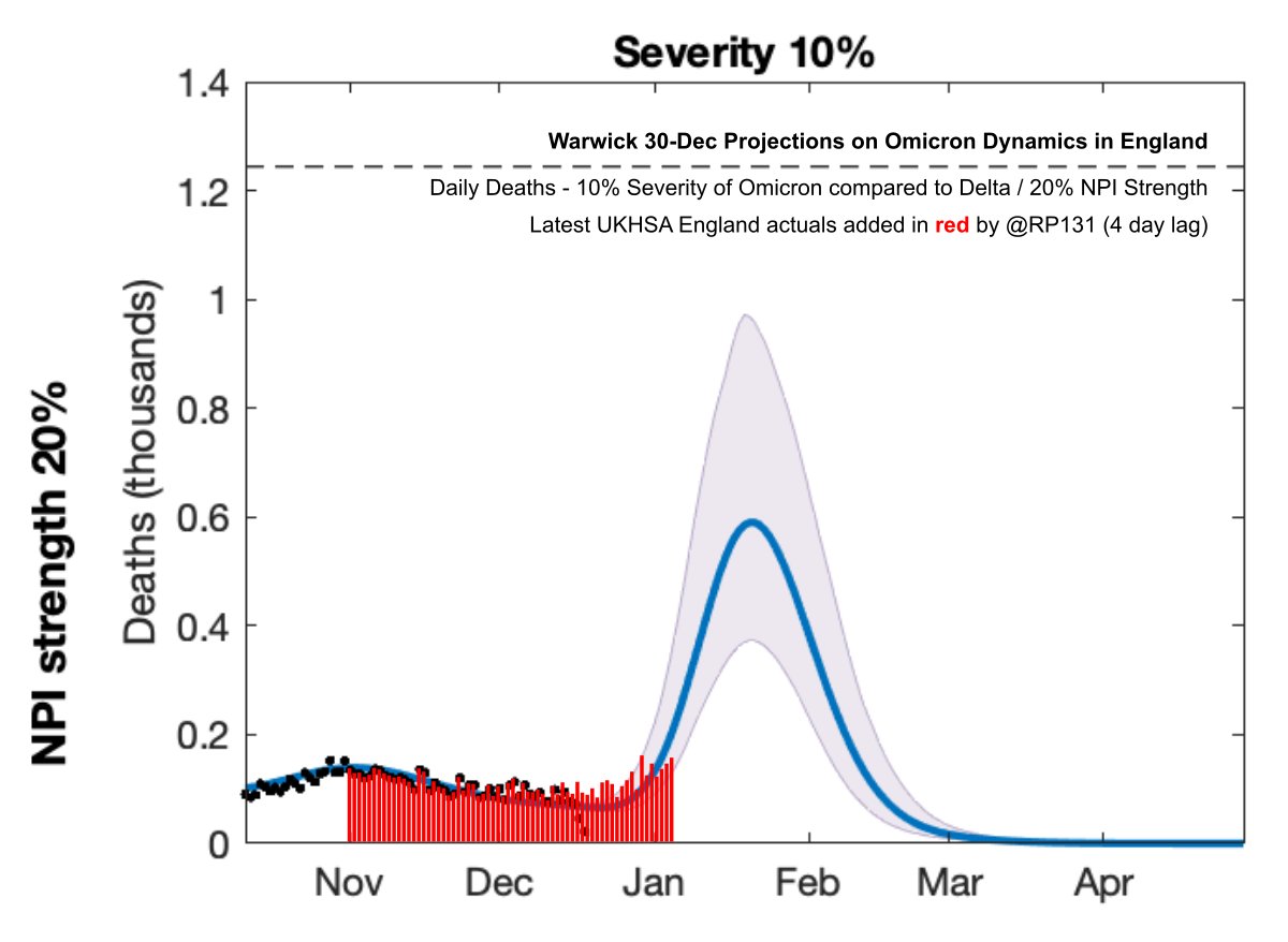 Warwick 30-Dec Projections based on Early Omicron Variant Dynamics in England with latest UKHSA actuals applied in red. I think it says that if Omicron is half as bad as Delta then with no further restrictions (dark red line) we'll have 1000 deaths per day by 7th January.