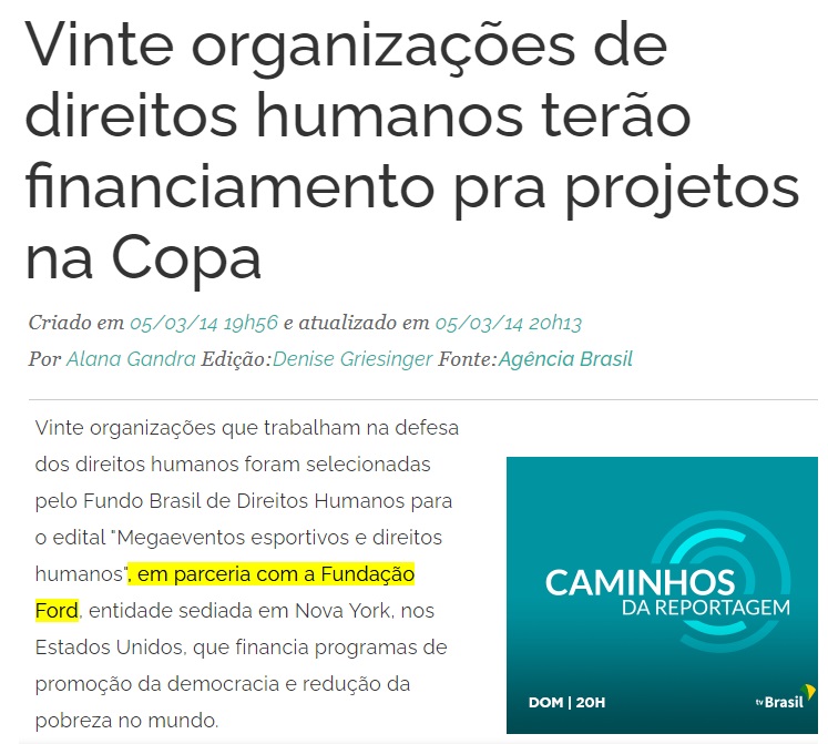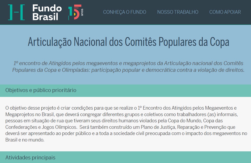 O Fundo Brasil foi criou, financiou e presidiu a Articulação Nacional dos Comitês Populares da Copa, responsável por conduzir 144 atos e protestos contra a Copa do Mundo em todas as cidades que sediaram o evento.