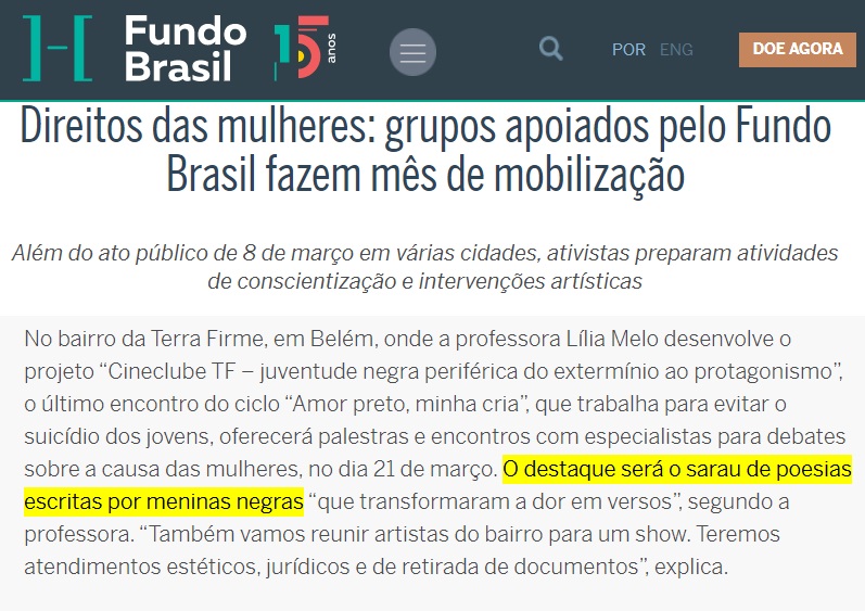 ...no governo Bolsonaro, com 20 milhões de pessoas passando fome, 60 milhões vivendo na miséria e comendo ossos, o Fundo Brasil tem preferido atuar com criação de cineclubes, slams, saraus de poesia, peças de teatro e organização de paradas do orgulho LGBTQIA+ nas favelas.