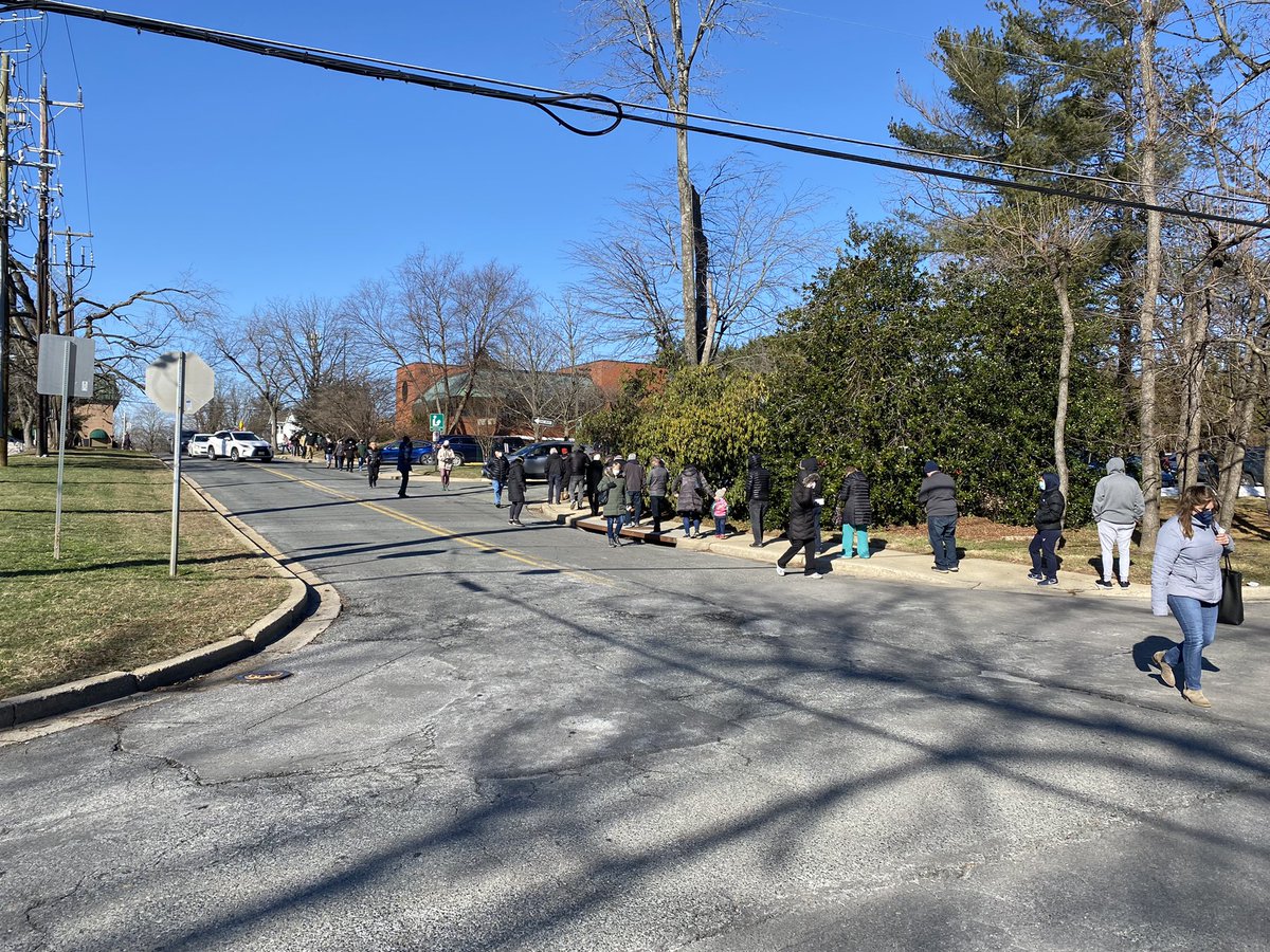 Long line of people ready for COVID test pickup at Montgomery County’s Potomac library. Line snakes all through the parking lot and then onto the sidewalk @WTOP