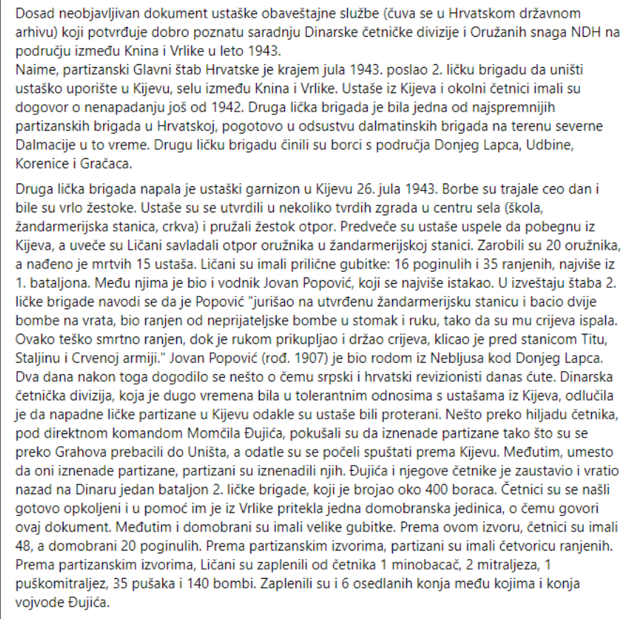 Dokument ustaške obaveštajne službe iz 1943. koji svedoči o saradnji Đujića i Oružanih snaga NDH protiv partizana koji su napali na ustaški garnizon u Kijevu: