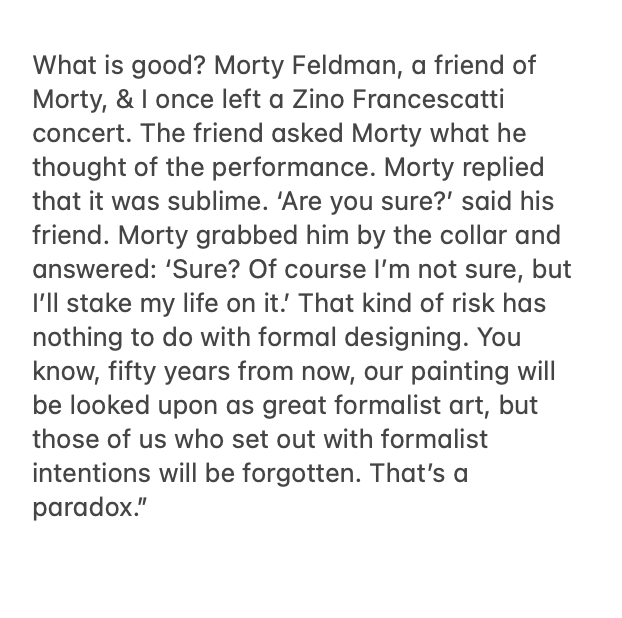 Irving Sandler quotes this story by Guston about Feldman in his memoir A Sweeper-Up After Artists.