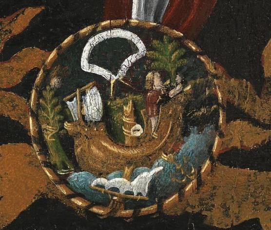wyrażający trudności – fizyczne i być może duchowe - napotkane w trakcie podróży. Nakrycie głowy detal zdobi pięć cienkich piór spiętych emaliowanym medalionem przedstawiającym statek tonący podczas burzy i otoczony zielonymi drzewami. Czyżby ten człowiek uratował się z morskiej