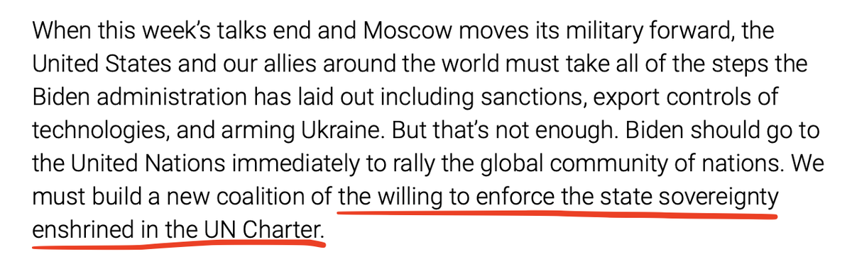 This op-ed by @EvelynNFarkas is making rounds: defenseone.com/ideas/2022/01/…. In a nutshell, she argues that the US must go to the United Nations to build a "coalition of the willing" and then demand that Russia withdraw from Ukraine and Georgia or face war.