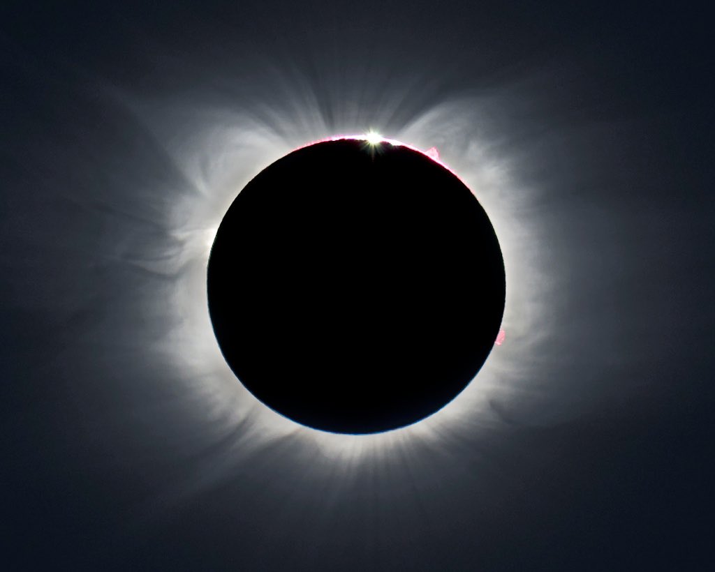 comenzara la breve totalidad, esta imagen de un telescopio terrestre dentro del borde de la trayectoria de sombras en “Union Glacier” captó los rayos solares, cerca de la parte superior del disco lunar. Se puede observar las prominencias solares rosadas que se arquean