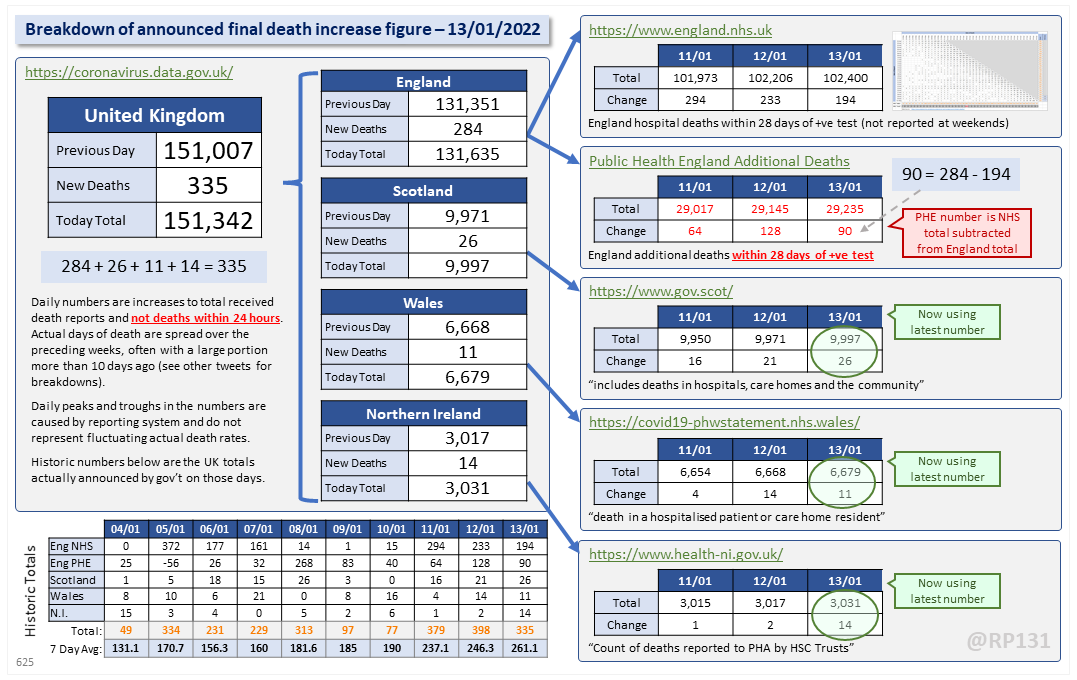 Dashboard for 13-Jan to explain the #covid19uk total death increase figure of 335.