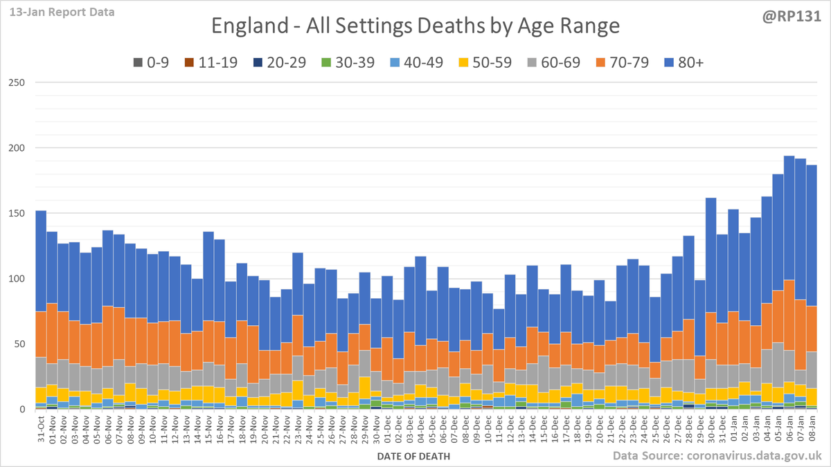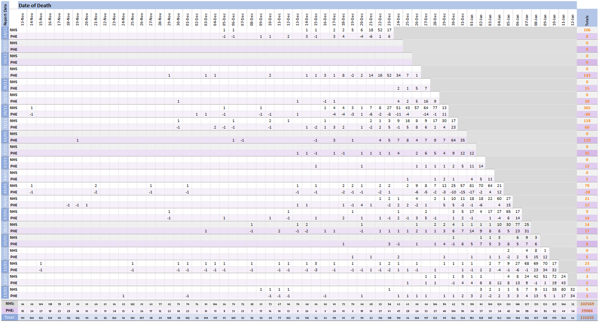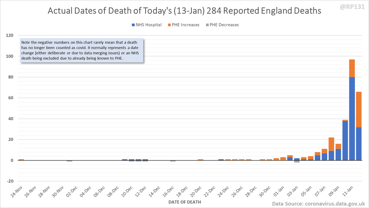 Pivot for 13-Jan to show breakdown of both 194 NHS and 90 (net) PHE deaths by date of death. The negatives are a combination of date of death corrections and accounting for NHS deaths that were already known to PHE. Small version for twitter first: