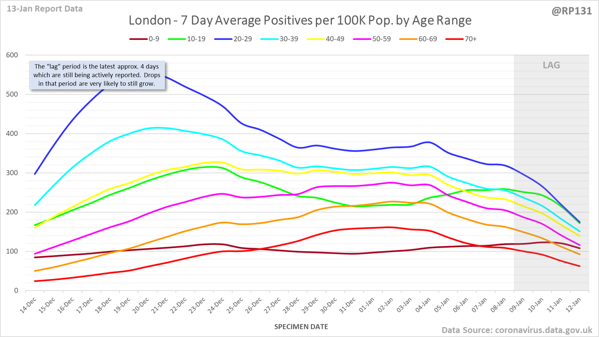 #covid19uk - Detailed positive tests thread. The majority of this thread is a set of views of rolling 7 day average positives per 100K by specimen date. Starting with England regions: